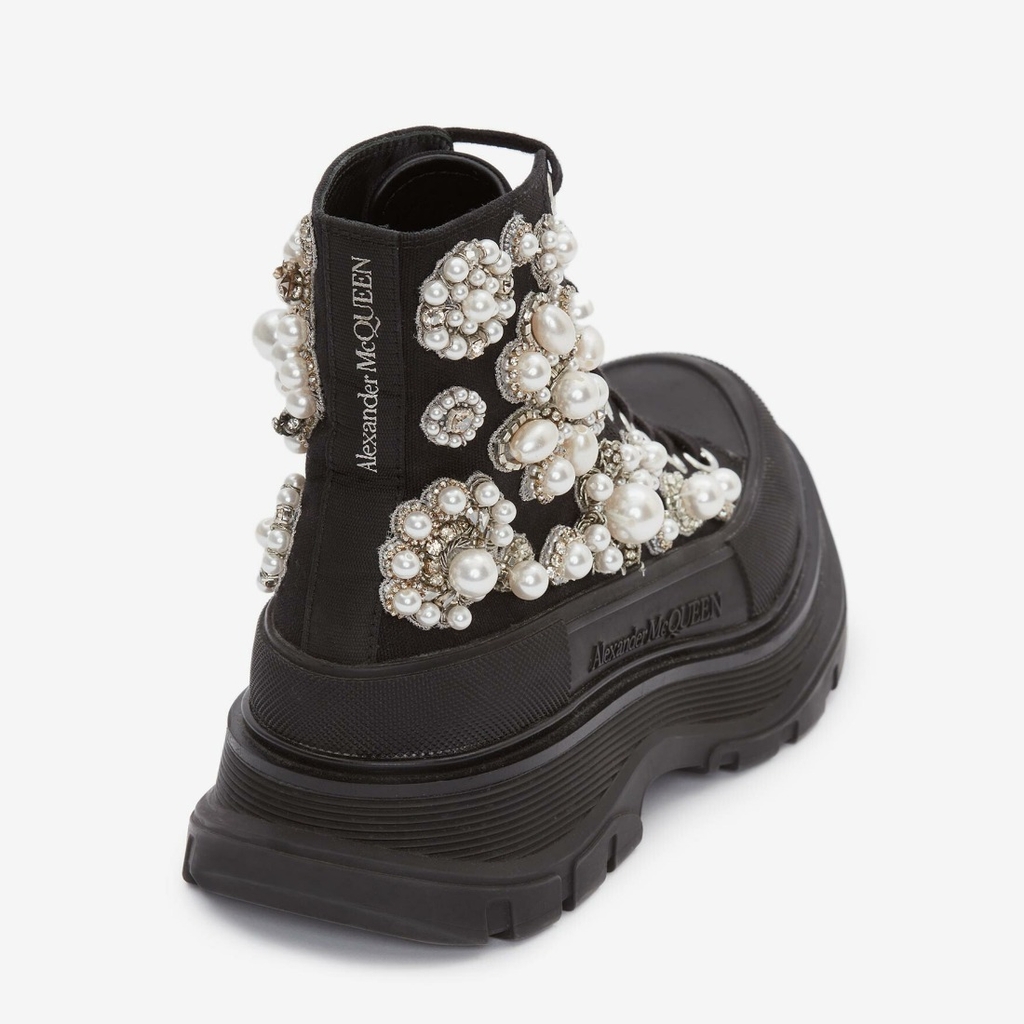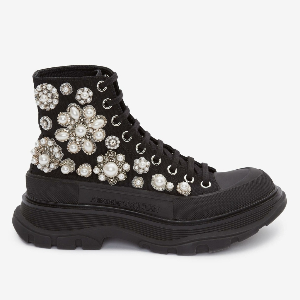 Giày bốt ren đen bằng vải bố được thêu bằng ngọc trai, vàng thỏi, pha lê và thủy tinh. Chiếc ủng được làm chi tiết với một bọc cao su có kết cấu và chữ ký Alexander McQueen tông màu, được hoàn thiện bằng một dải ruy băng đặc trưng ở mặt sau của chiếc ủng. Dáng boot cổ tròn với chi tiết mũi giày cao su.
