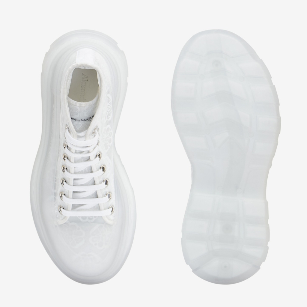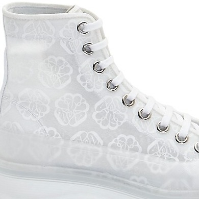 Ủng có ren trong suốt với logo con dấu và đế cao su dày. Những đôi ủng này được hoàn thiện bằng cao su kết cấu và có chữ ký Alexander McQueen phù hợp và một băng logo ở phía sau. Hình dáng khởi động với mũi giày tròn và mũi giày cao su.