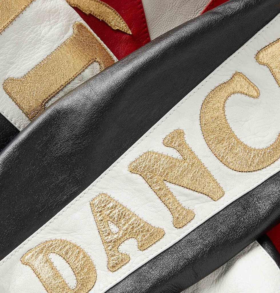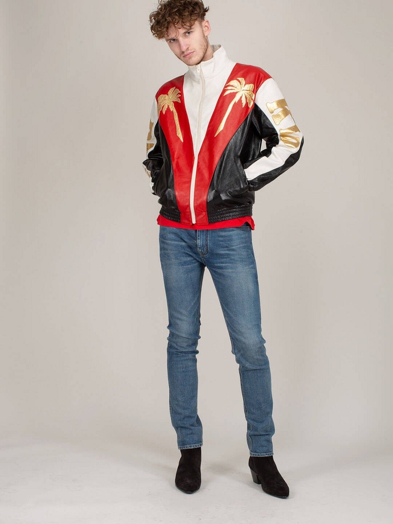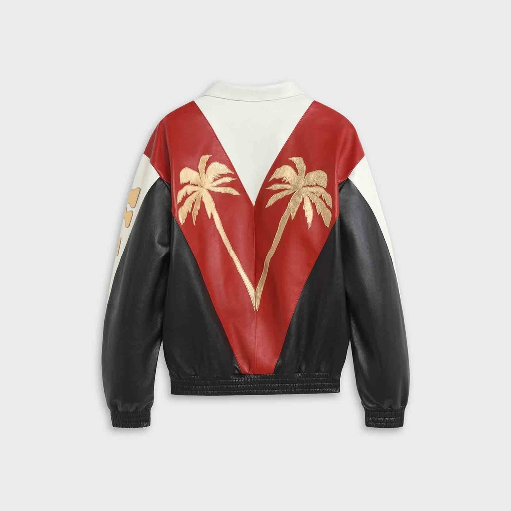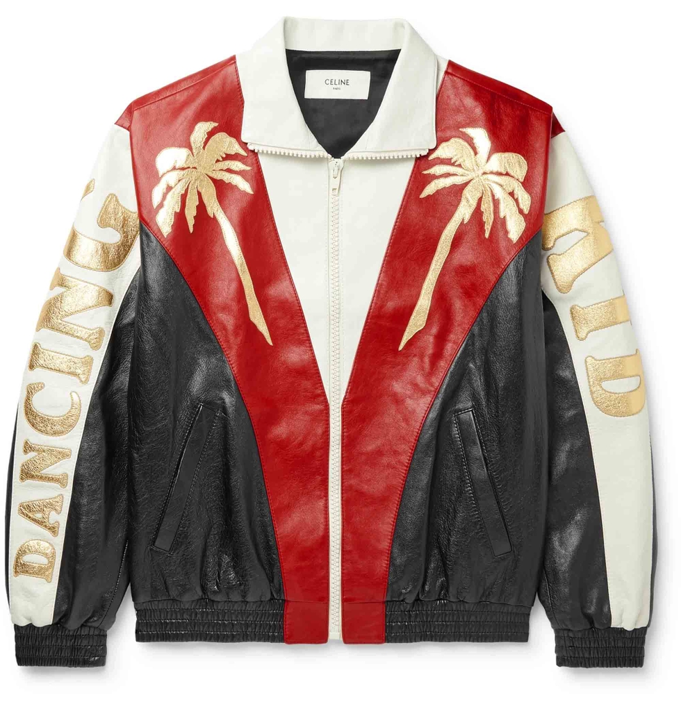 CELINE HOMME bày tỏ lòng kính trọng với Americana thời xưa trong bộ sưu tập SS21 của mình, và chiếc áo khoác bomber này mang một cảm giác đặc biệt của thập niên 80. Nó được làm từ các tấm giả da màu trắng, đen và đỏ và có chi tiết với tiêu đề của chương trình, 'The Dancing Kid', cũng như những cây cọ vàng phù hợp. Cấu hình trơn trượt chỉ làm tăng thêm sức hấp dẫn cổ điển của nó.