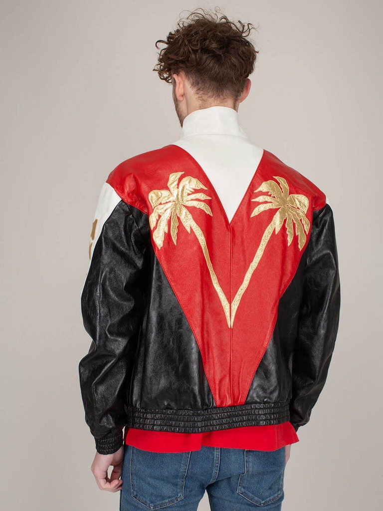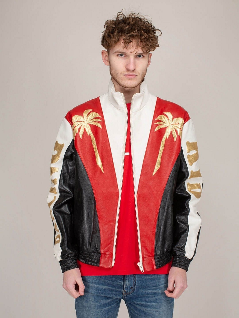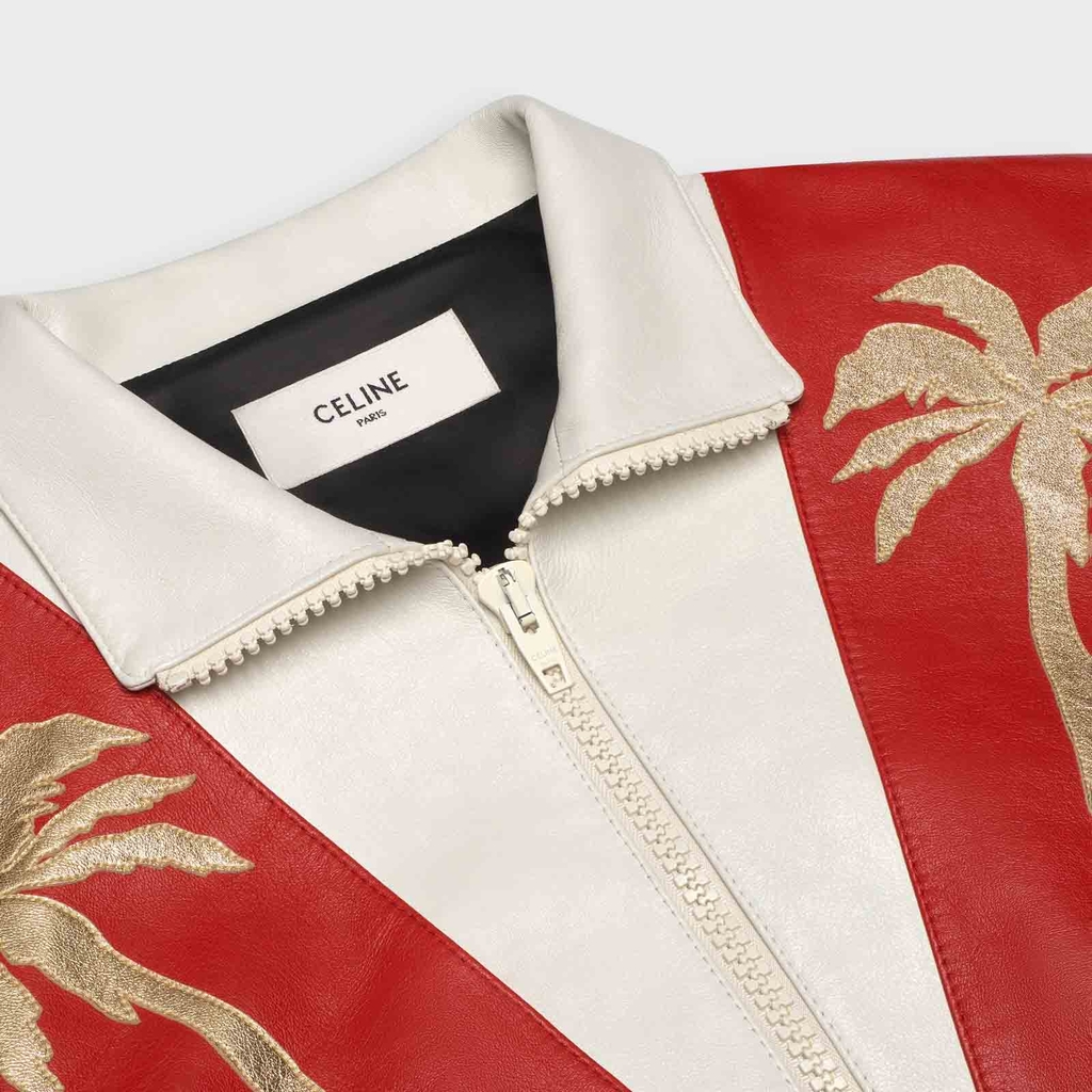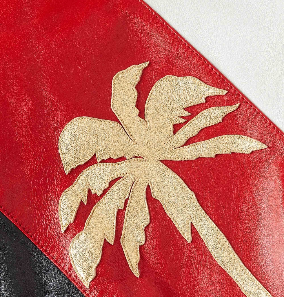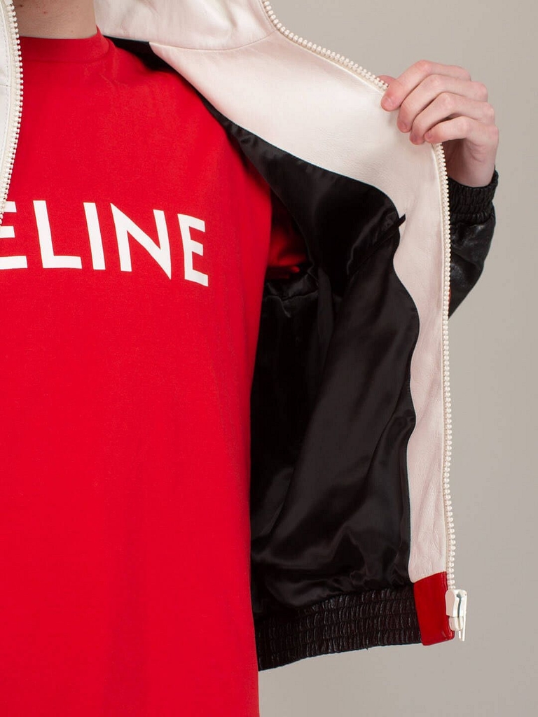 CELINE HOMME bày tỏ lòng kính trọng với Americana thời xưa trong bộ sưu tập SS21 của mình, và chiếc áo khoác bomber này mang một cảm giác đặc biệt của thập niên 80. Nó được làm từ các tấm giả da màu trắng, đen và đỏ và có chi tiết với tiêu đề của chương trình, 'The Dancing Kid', cũng như những cây cọ vàng phù hợp. Cấu hình trơn trượt chỉ làm tăng thêm sức hấp dẫn cổ điển của nó.