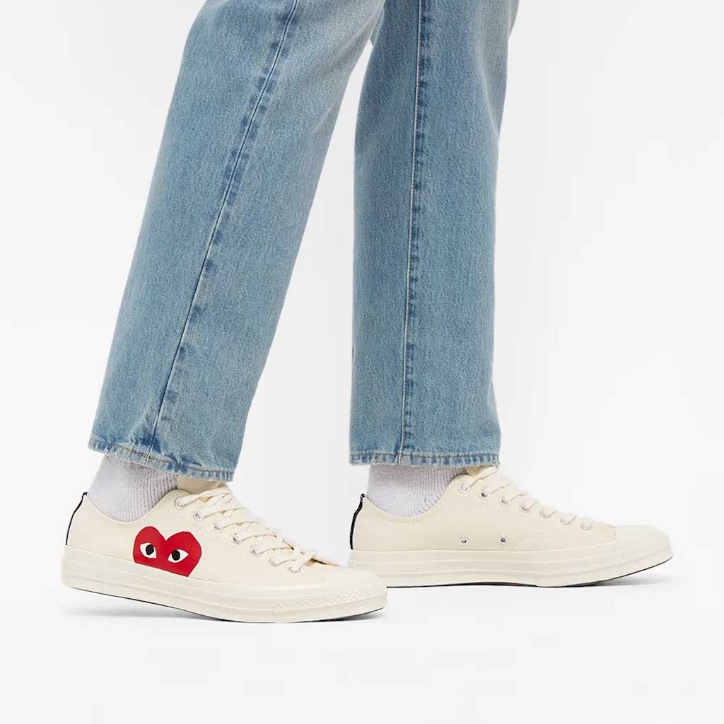 Comme des Garçons x Chuck Taylor 1970 Low 'Play' là một phiên bản màu đặc biệt được thiết kế bởi nghệ sĩ đồ họa Filip Pagowski và người sáng lập Comme des Garçons Rei Kawakubo. Giày có phần trên bằng vải Milk với một trái tim màu đỏ CDG đặc trưng quá khổ được in ở các tấm lót. Đôi giày thể thao này cũng đi kèm với mũi giày cao su và đế cao su lưu hóa của những năm 1970.