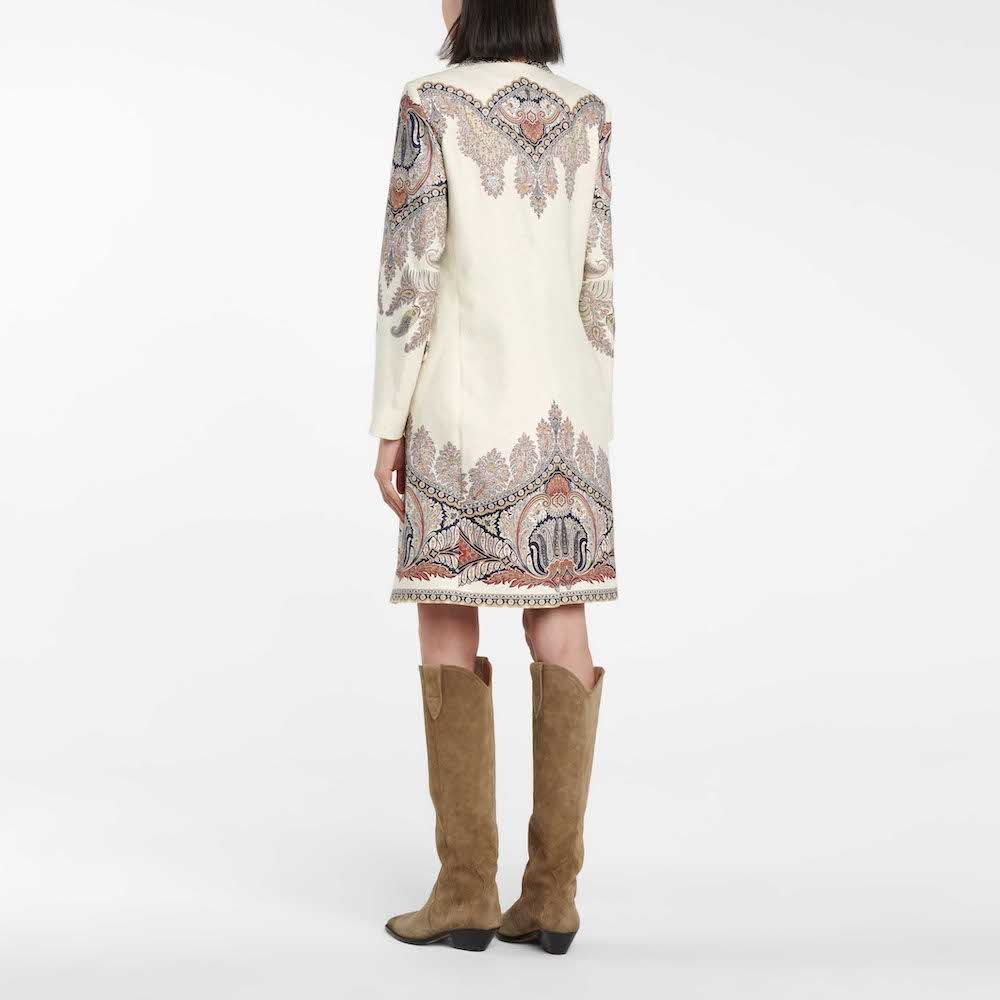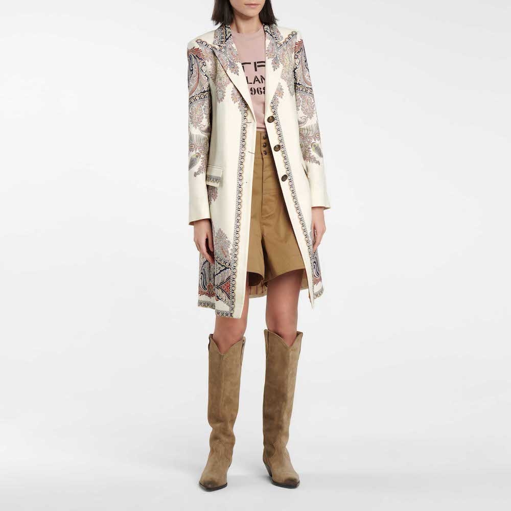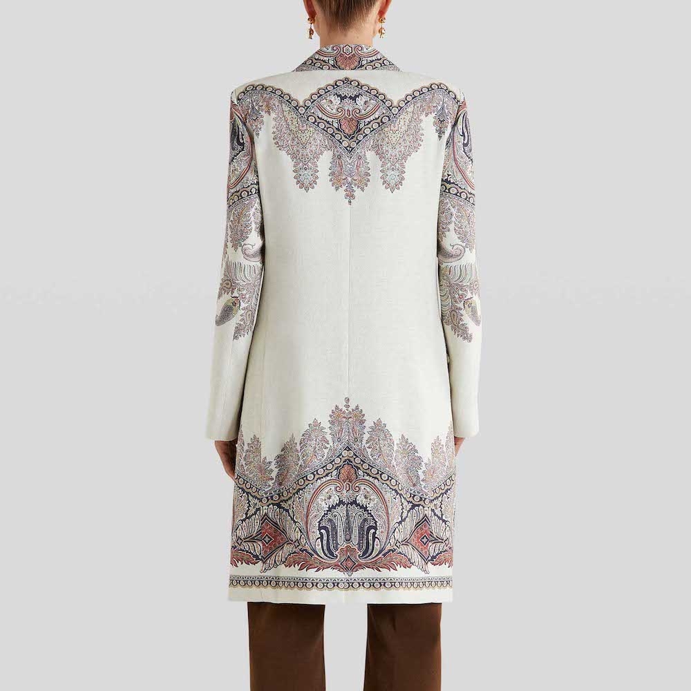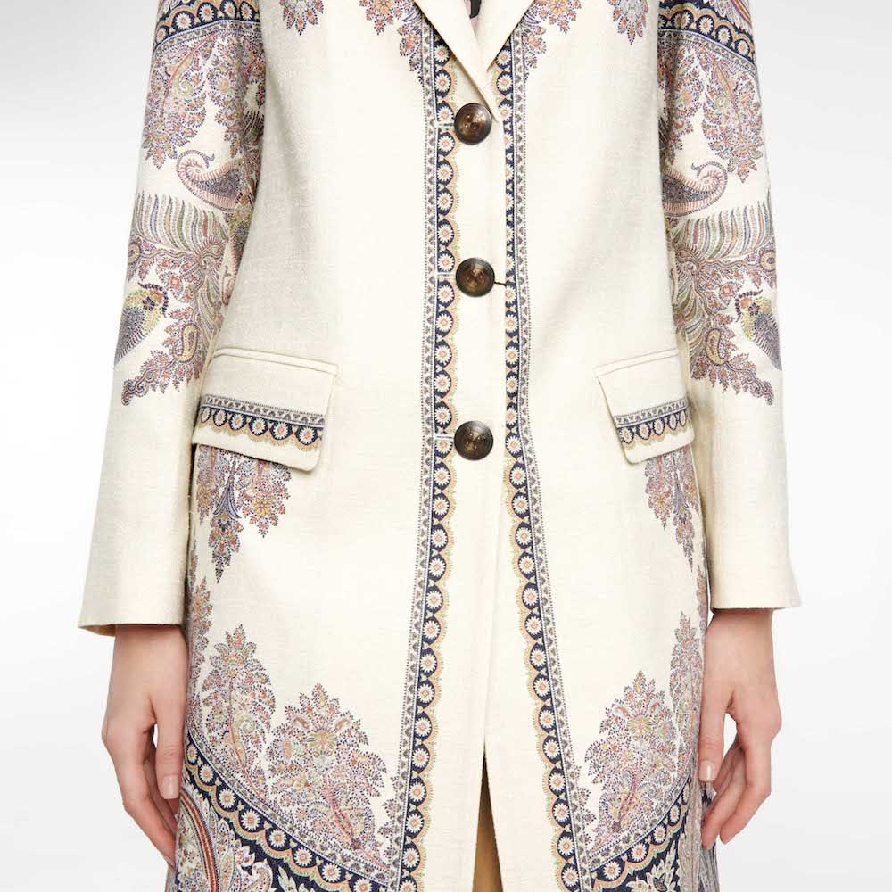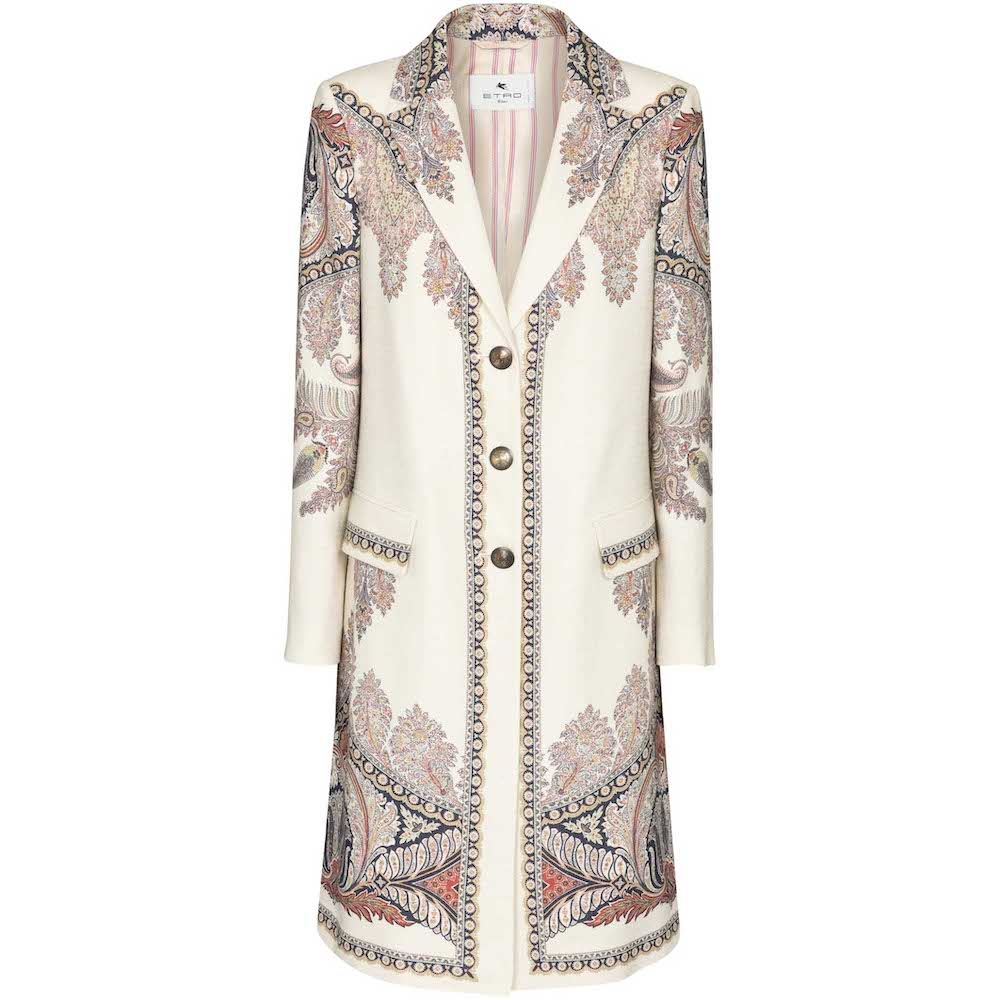 Các mã phóng túng nâng cao của ETRO được thể hiện bằng lớp áo khoác màu trắng này. Được làm từ sự pha trộn của vải lanh, lụa và bông, nó được thiết kế theo kiểu dáng thẳng với đệm lót nhẹ giúp mở rộng khung. Một họa tiết hoa lê nhiều màu nhô vào trong từ các cạnh để tạo thành một lớp hoàn thiện chữ ký nhãn.