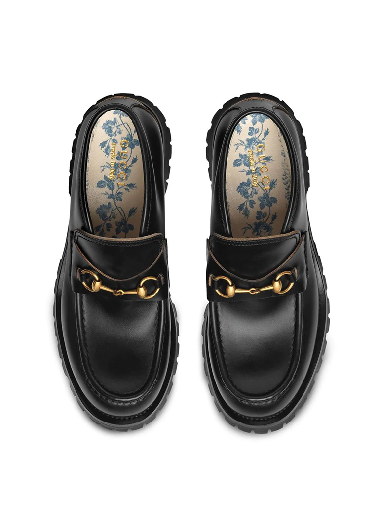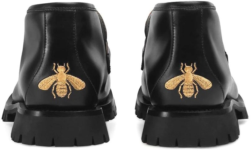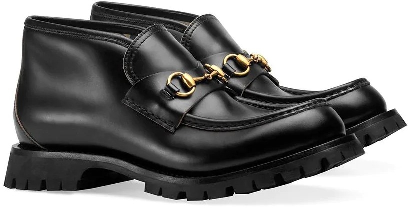 A mainstay in Gucci history since the '50s, the classic Horsebit loafer bridges the past to the present. A homage to the House's heritage rooted in the equestrian world, the emblematic shape is reworked in a contemporary ankle boot shape on a rubber lug sole. Black leather. Bee detail at the back. Blue rosebuds print sole. Horsebit detail. Rubber lug sole. .5" height. 4" shaft height. Made in Italy.