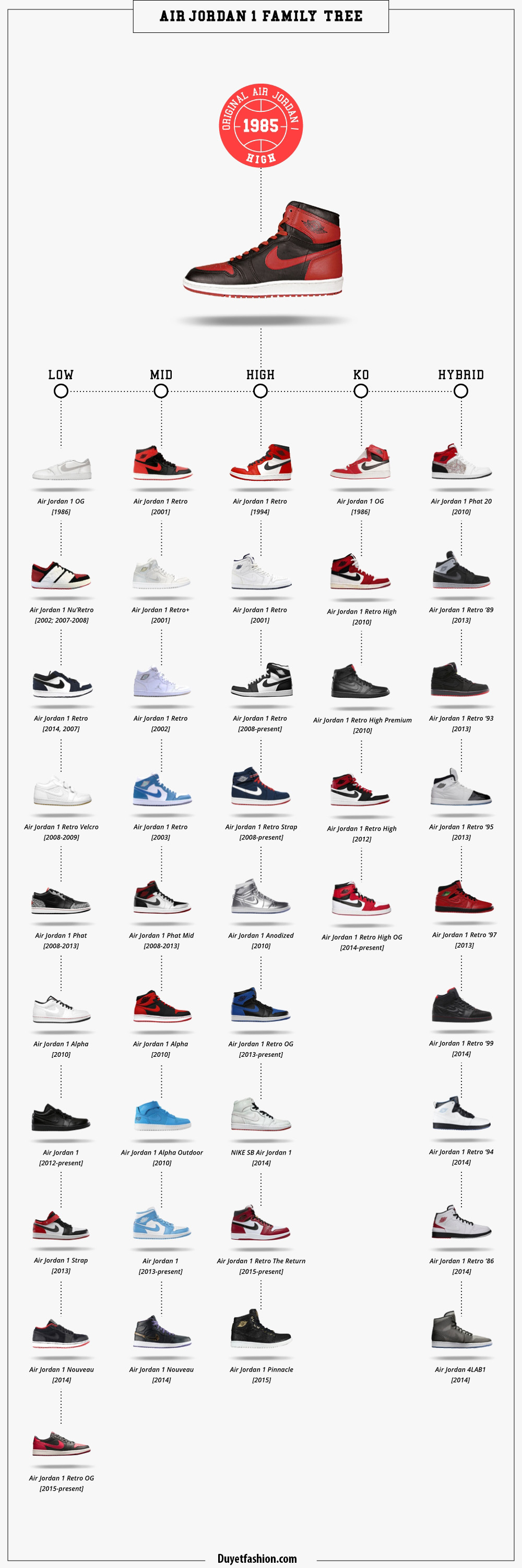 Để đem tới cho các bạn yêu Sneaker một cái nhìn tổng quan về dòng giày huyền thoại này, bài viết tập trung đề cập tới những mẫu giày tiêu biểu dọc theo chiều dài lịch sử 36 năm ra đời của Air Jordan 1. Để dễ hình dung hãy quan sát sơ đồ ở phía dưới.