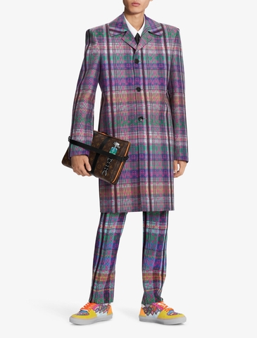 Chiếc áo khoác thông minh này nói về chủ đề LV Pink Madras của mùa. Nó được thiết kế vừa vặn thông thường từ vải jacquard len tartan nguyên chất, xoắn với họa tiết LV Monogram màu hồng. Miếng đệm vai tăng thêm cấu trúc cho hình bóng, trong khi nút trên cùng của LV và một nửa lớp lót Monogram Gradient màu đen thêm vào cảm giác đặc trưng.