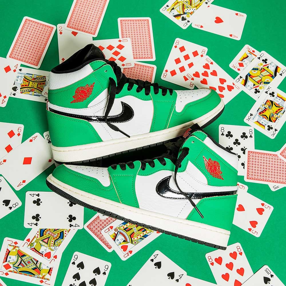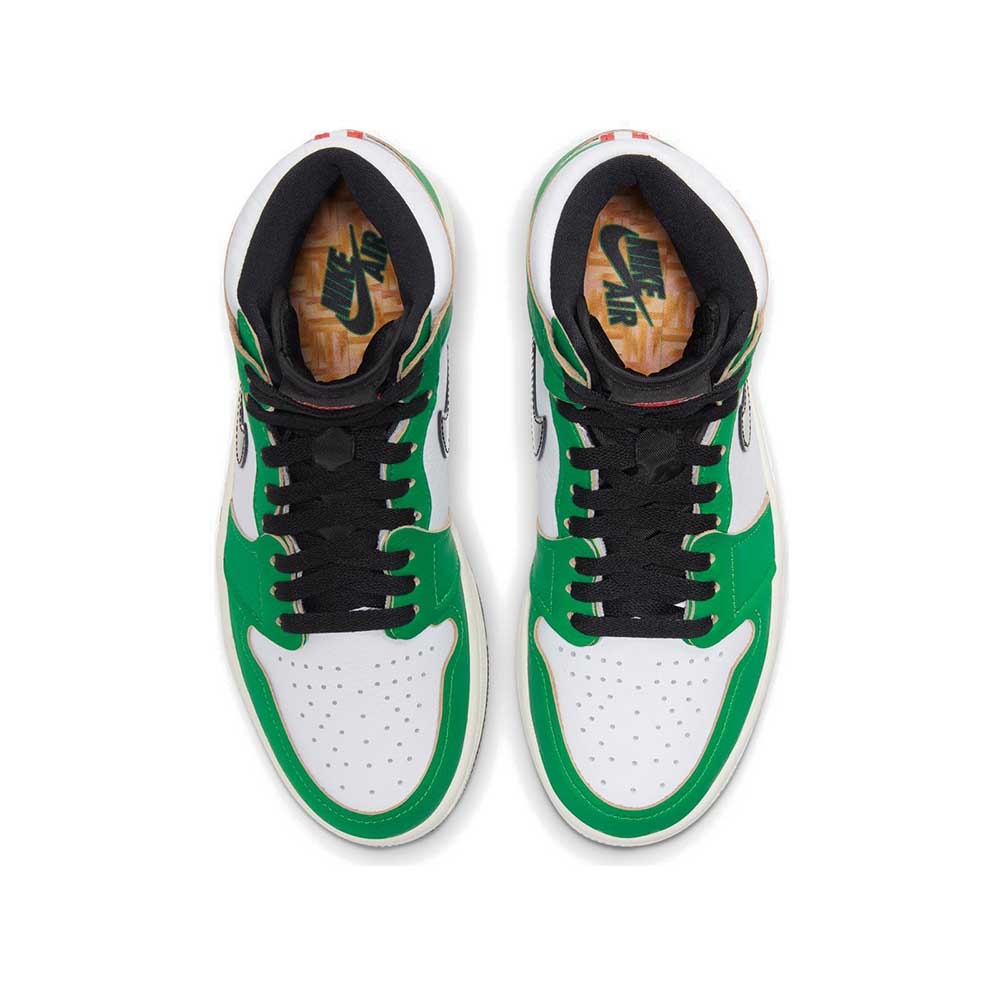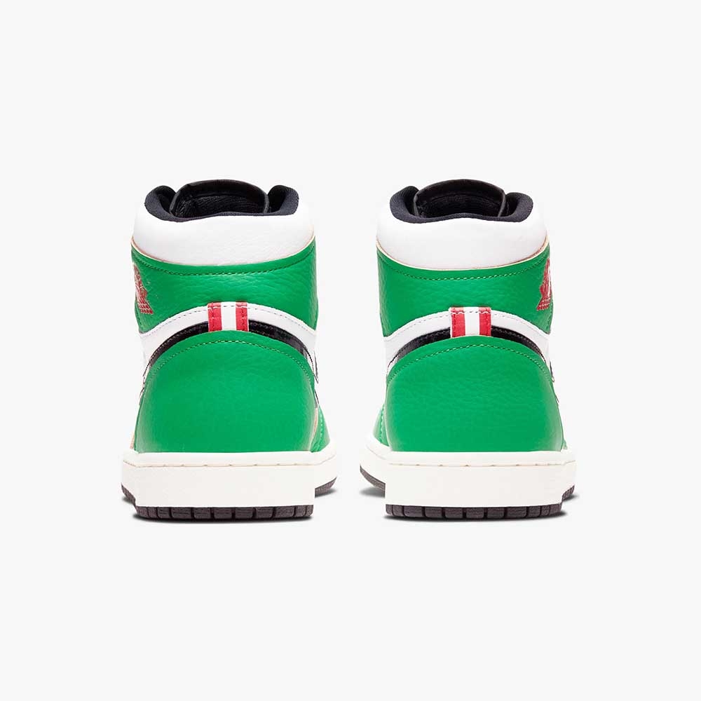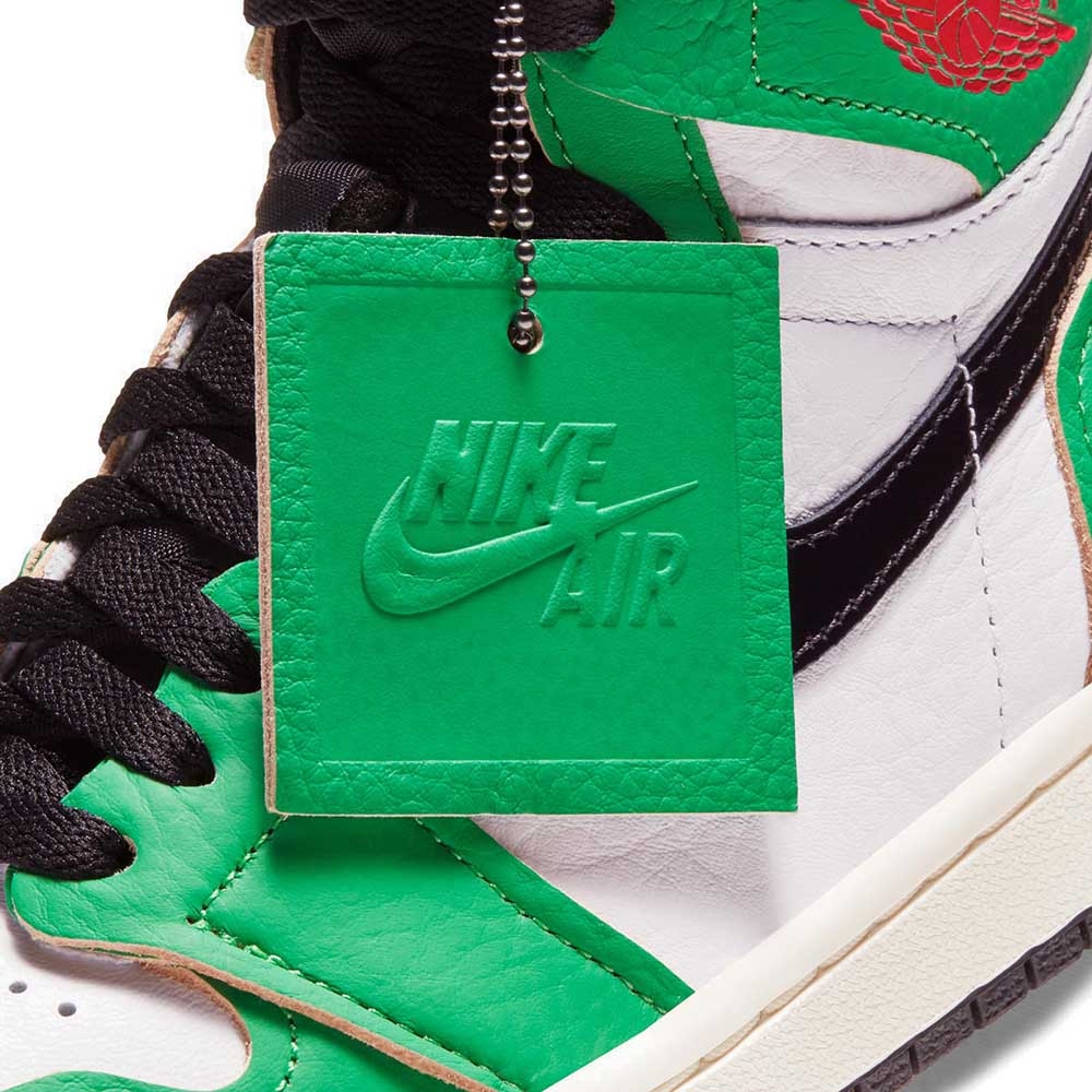 Nike Air Jordan 1 Retro High OG ‘Lucky Green’ lấy cảm hứng từ điểm nổi bật ban đầu trong sự nghiệp của Michael Jordan - cụ thể là trận đấu 63 điểm của His Airness tại Boston Garden cũ trong vòng loại trực tiếp năm 1986. Phần trên cao sử dụng cách ngăn hai tông màu cổ điển, nổi bật với phần đế bằng da màu trắng và lớp phủ da màu xanh lá cây tương phản với các đường viền thô để tạo ra một thẩm mỹ tinh tế chưa hoàn thiện. Các yếu tố xây dựng thương hiệu bao gồm dấu Swoosh màu đen, thẻ lưỡi Nike Air và biểu tượng Wings màu đỏ trên nắp cổ áo bên.