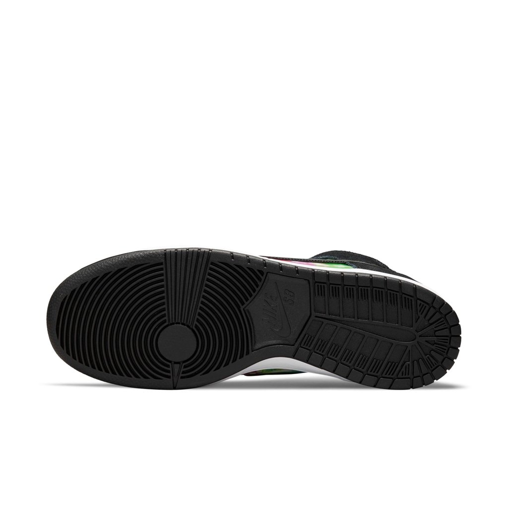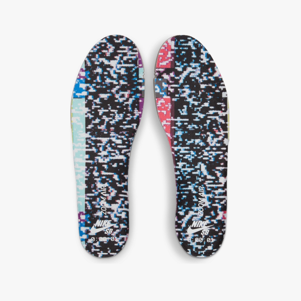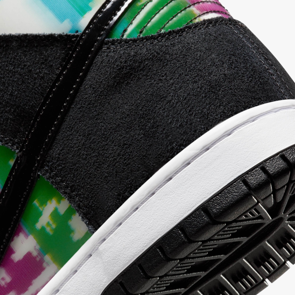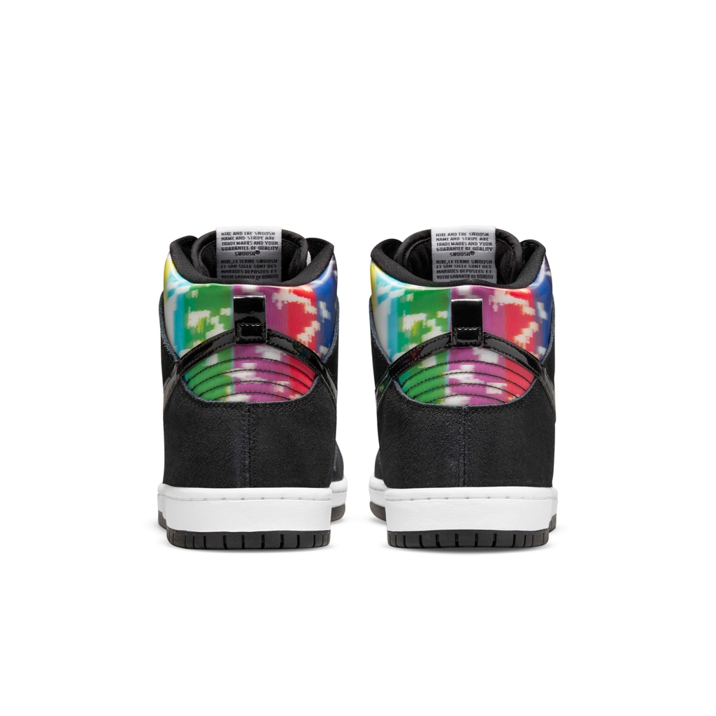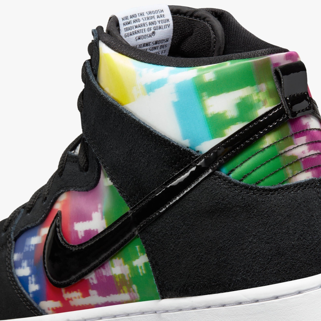 Nike Dunk High SB ‘TV Signal’ lấy cảm hứng từ một thời đã qua khi các video về ván trượt được quay trên băng VHS và xem trên TV analog. Sản phẩm cao cấp có đế bằng da màu trắng với lớp da lộn màu đen tương phản và dấu Swoosh màu đen phù hợp bằng da sáng bóng. Bản in nhiều màu dạng thấu kính làm sống động bảng điều khiển và cổ áo, bắt chước tín hiệu bị lỗi trên TV CRT cổ điển. Các họa tiết xáo trộn được lặp lại trên đế lót giày, có bộ phận Zoom Air ở gót chân để tạo lớp đệm nhẹ.