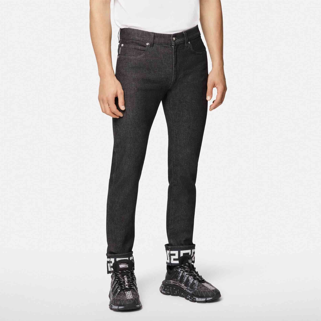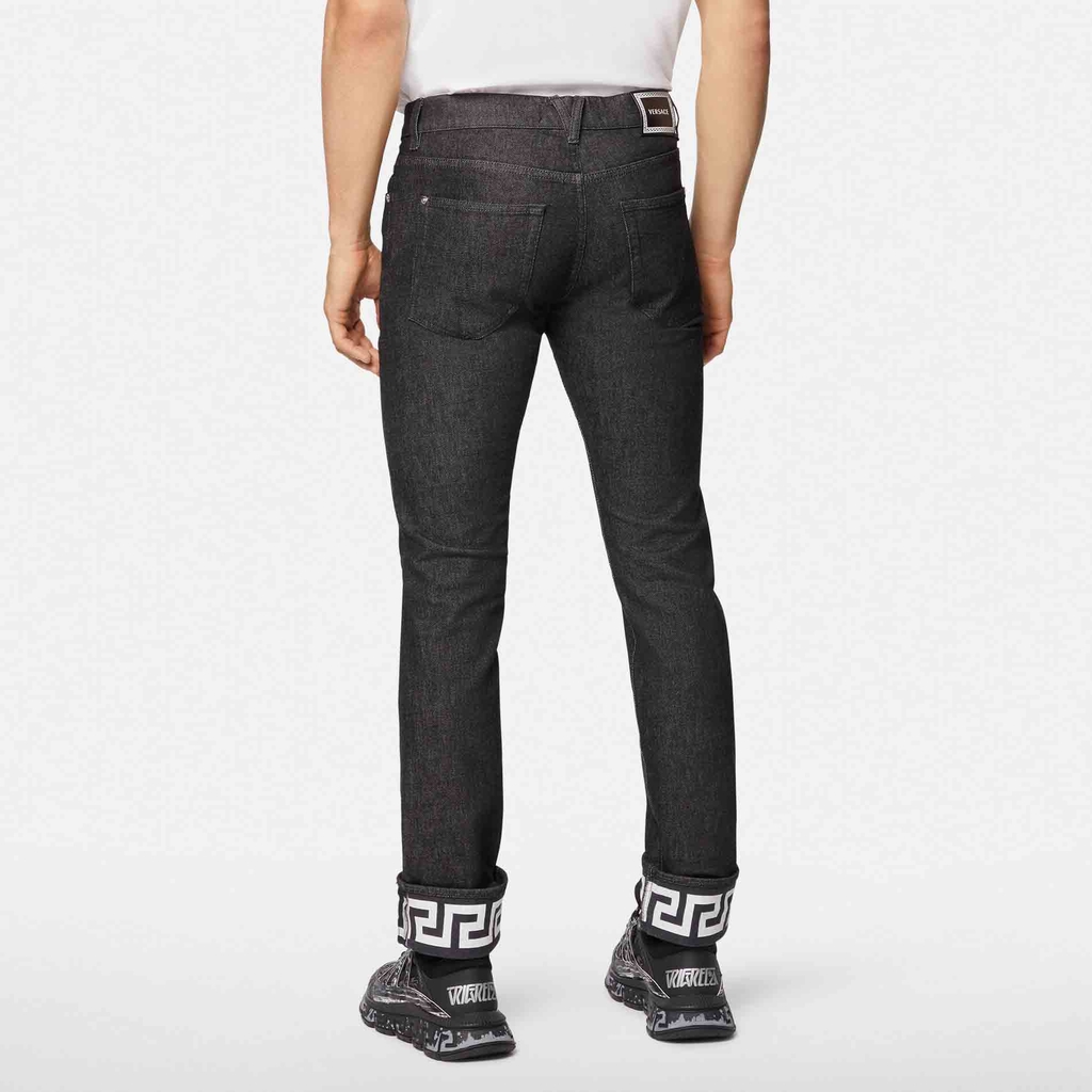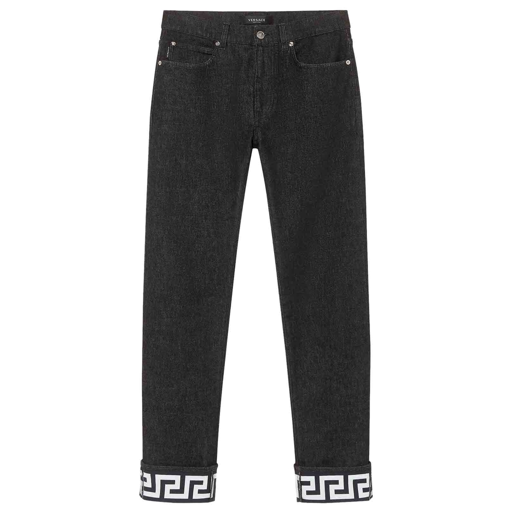 Một thiết kế thực sự linh hoạt, những chiếc quần jean denim co giãn này chuyển đổi liền mạch từ văn phòng sang giờ hạnh phúc và ngoại hình. Kiểu dáng mỏng được tô điểm bằng họa tiết Greca in trên nếp gấp.