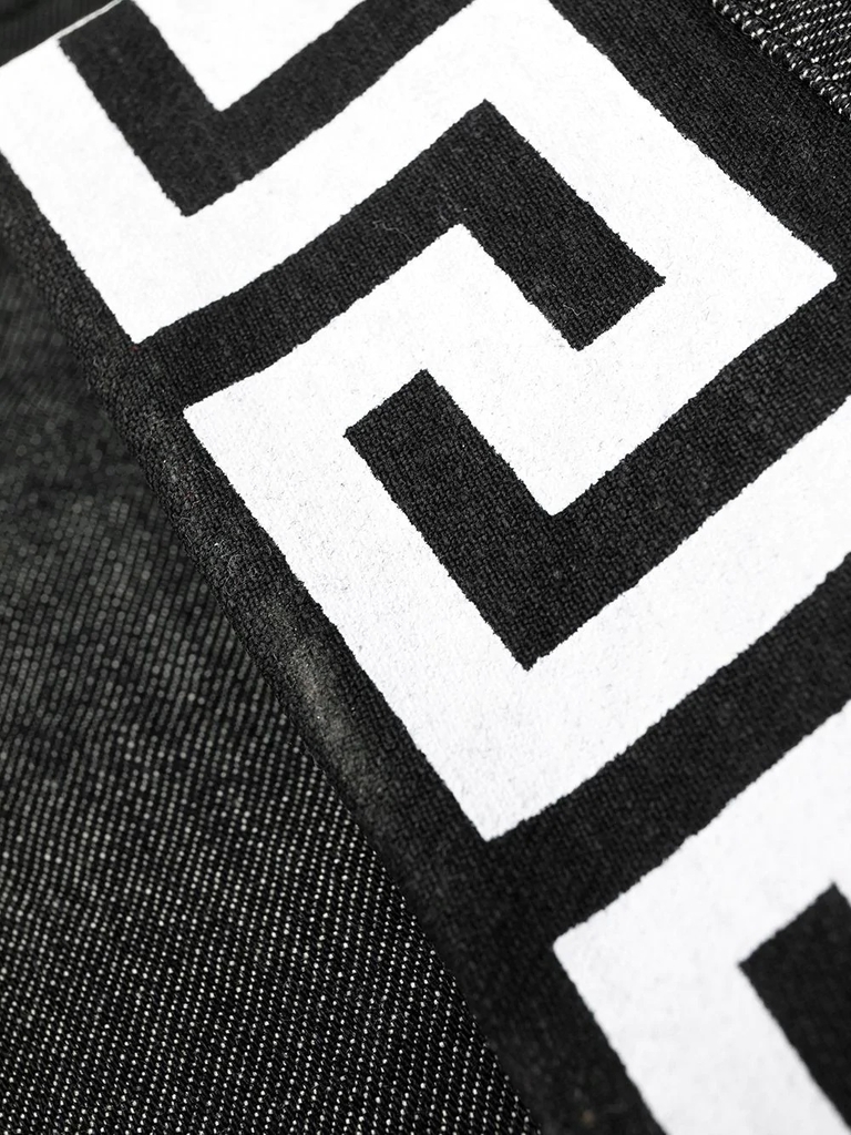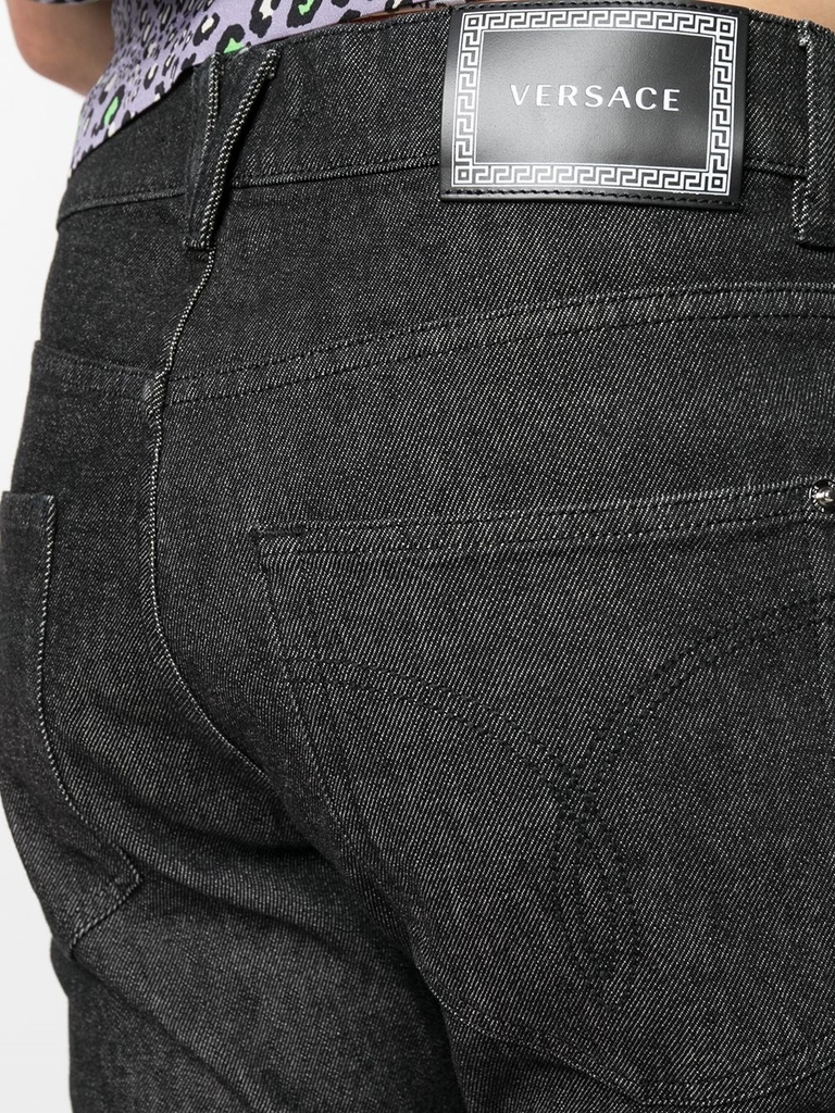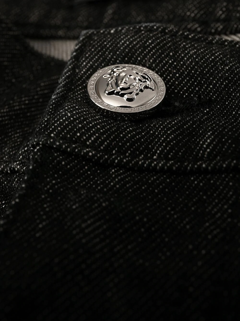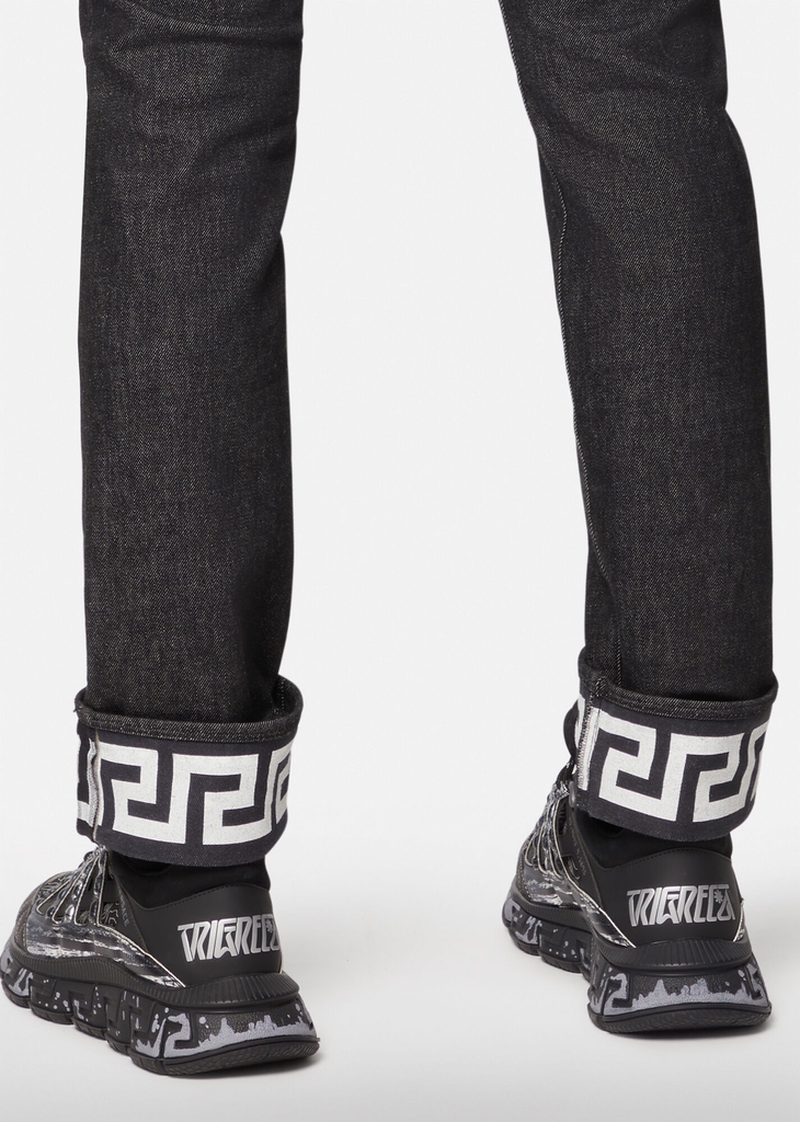 Một thiết kế thực sự linh hoạt, những chiếc quần jean denim co giãn này chuyển đổi liền mạch từ văn phòng sang giờ hạnh phúc và ngoại hình. Kiểu dáng mỏng được tô điểm bằng họa tiết Greca in trên nếp gấp.
