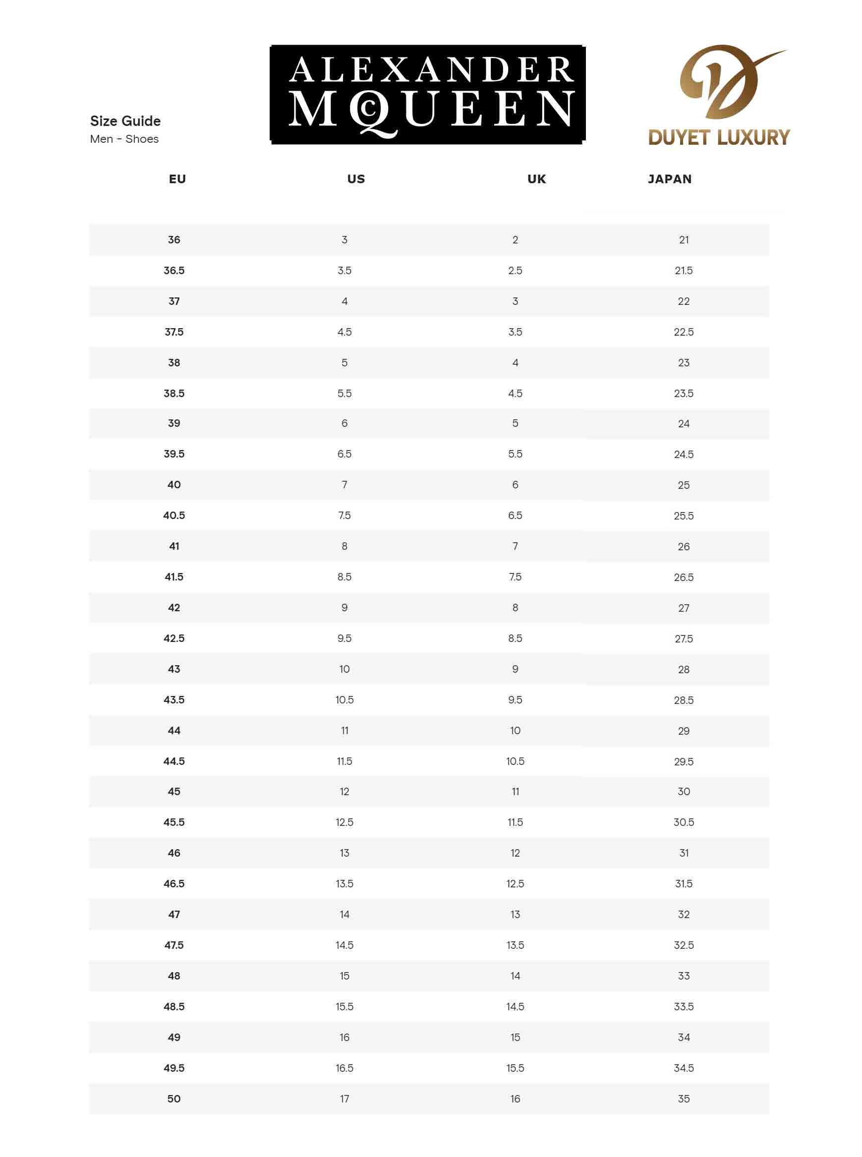 BẢNG SIZE GIÀY ALEXANDER McQUEEN: