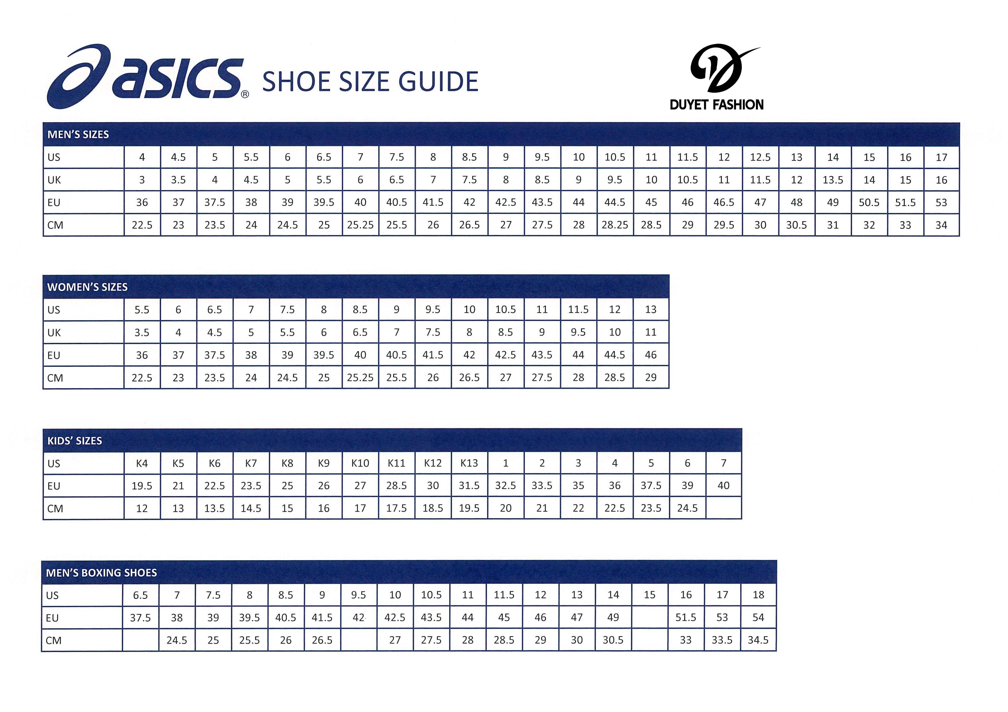 BẢNG SIZE GIÀY ASICS: