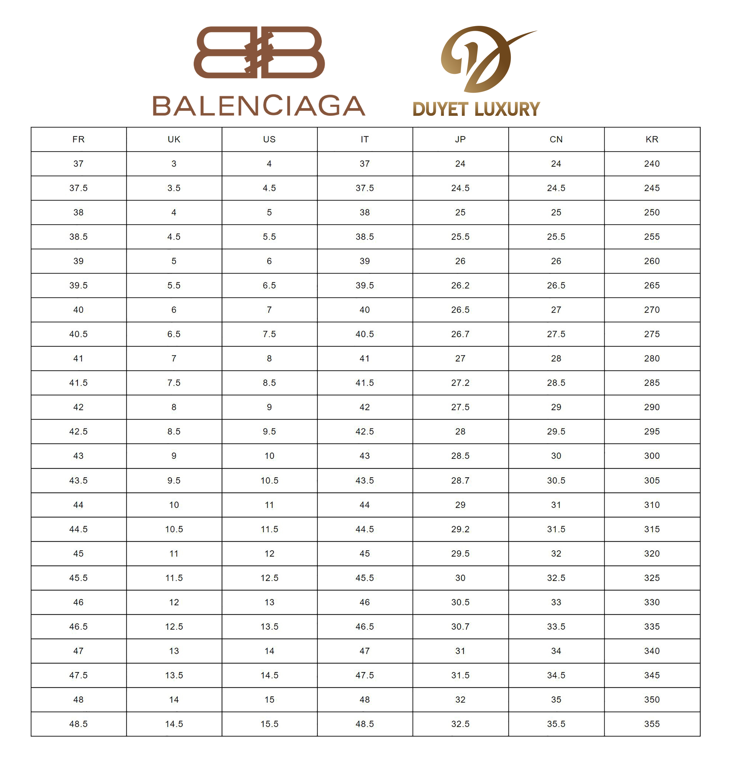 BẢNG SIZE GIÀY BALENCIAGA:
