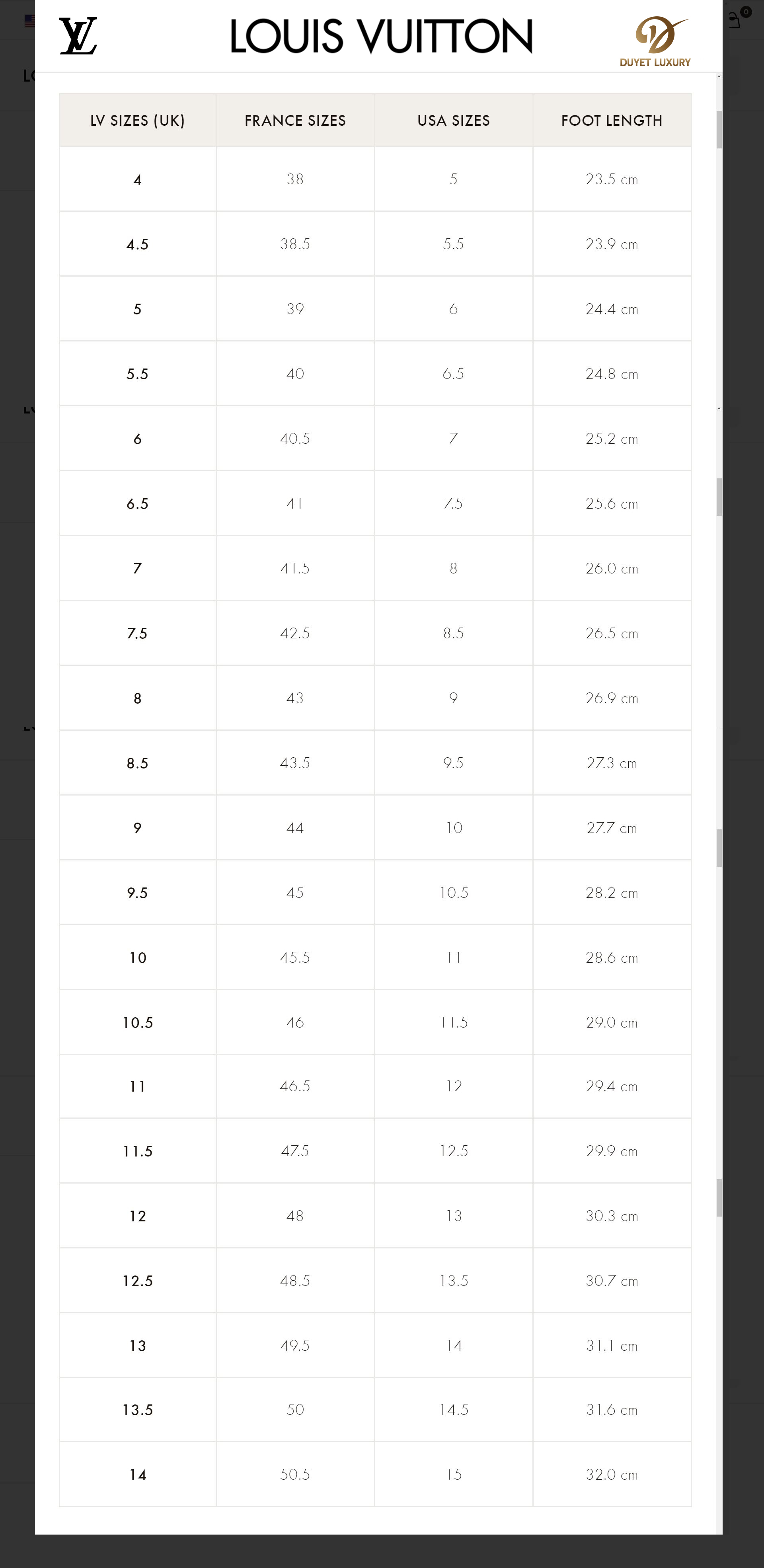 BẢNG SIZE GIÀY LUOIS VUITTON: