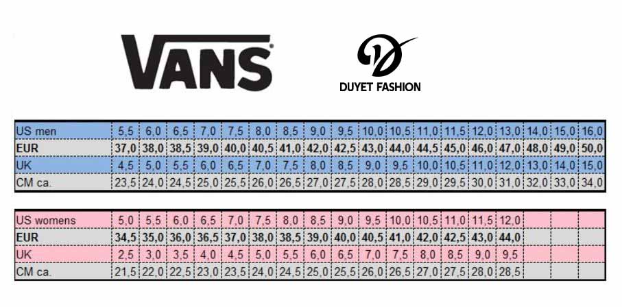 BẢNG SIZE GIÀY VANS:
