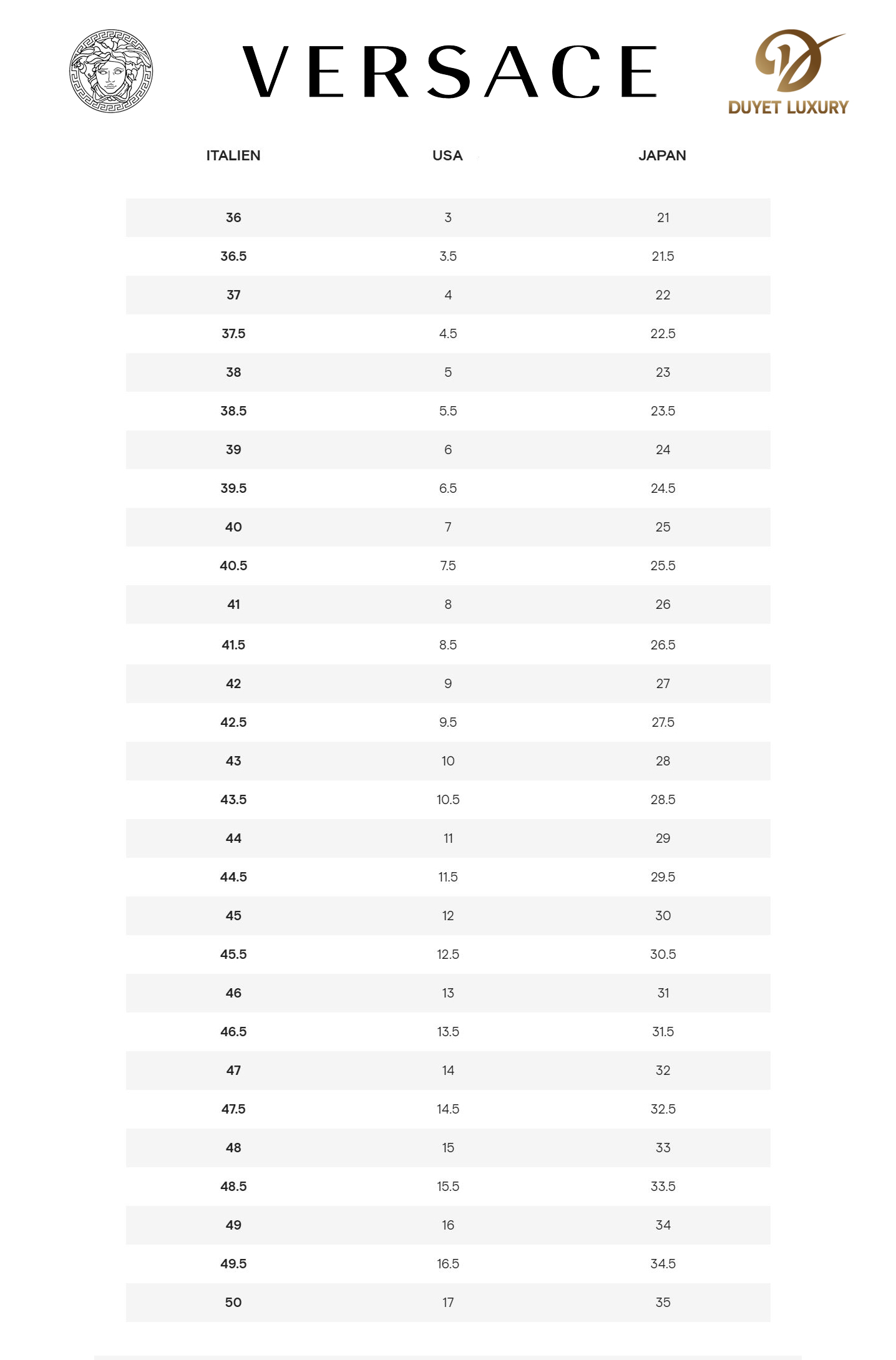 BẢNG SIZE GIÀY VERSACE: